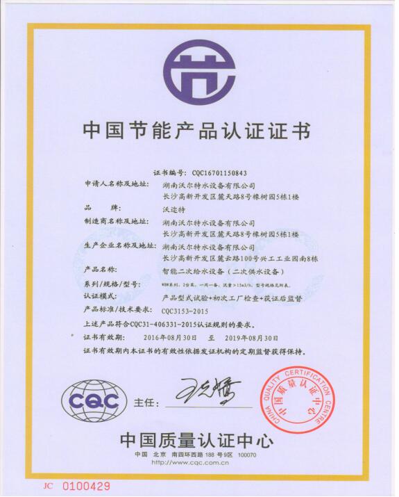 6月6日上午涉外經(jīng)濟學院機電一體化、汽車自動化專業(yè)的大一新生在學院的組織下集體來到湖南沃爾特水設備有限公司參觀學習,沃爾特公司總經(jīng)理陳武全程為師生講解答疑,讓師生們對二次供水行......湖南沃爾特水設備有限公司產(chǎn)品獲中國節(jié)能產(chǎn)品認證
